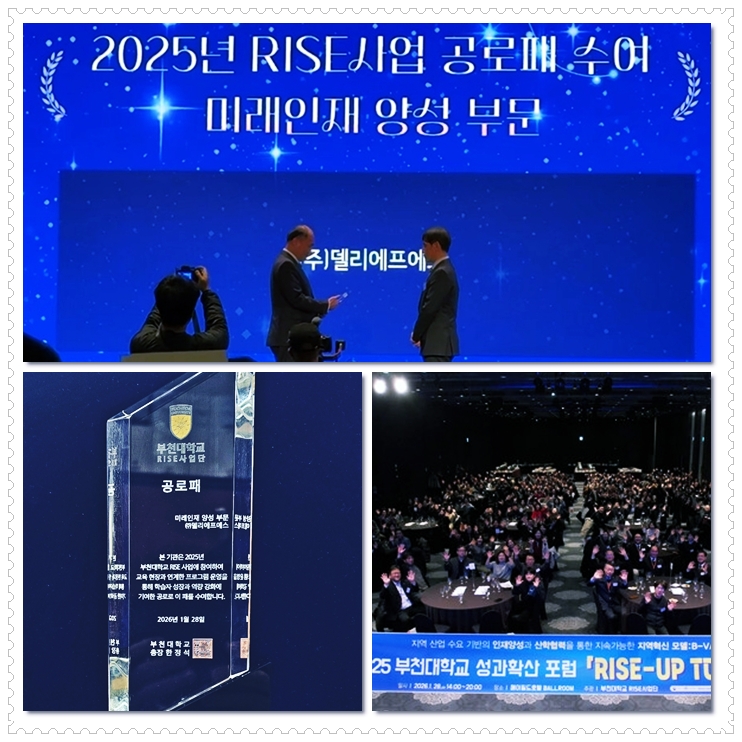 | 2026년 1월 28일 메이필드 호텔에서 개최된 '부천대학교 라이즈사업 성과확산포럼'에서 당사가 '지산학 협력 성과'로 '감사패'를 수상하였습니다. 당사는 부천대학교 외에 신구대학교, 한양여자대학교, 배화여자대학교, 연성대학교, 유한대학교, 경인여자대학교, 서일대학교, 숭의여자대학교, 장안대학교, 동남보건대학교 등 서울,수도권 지역 대학교와의 산학협력을 통해 청년일자리창출에 기여하는 한편 현장실습 사업 및 교육과정 개선사업 등에 적극적으로 참여하고 있습니다. |